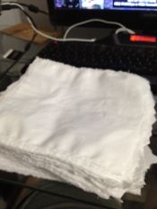 Notes: I have found that cutting a small starting cut and tearing the fabric is an easy way to get squares. I cut 6 inch x full length strips, then cut those into squares. Bed sheets make great fabric – one king size bed sheet will give a little over 150 squares depending on size.