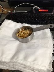 Step 2:– Place a scoop of bird seed into the center of a square. Many guides will say “film container volume” – I find a little less than 1/4 cup of seed works best (about 1/5 cup)– It is better to have a little more seed than too little.– Remove any large particles that make it into the packet.