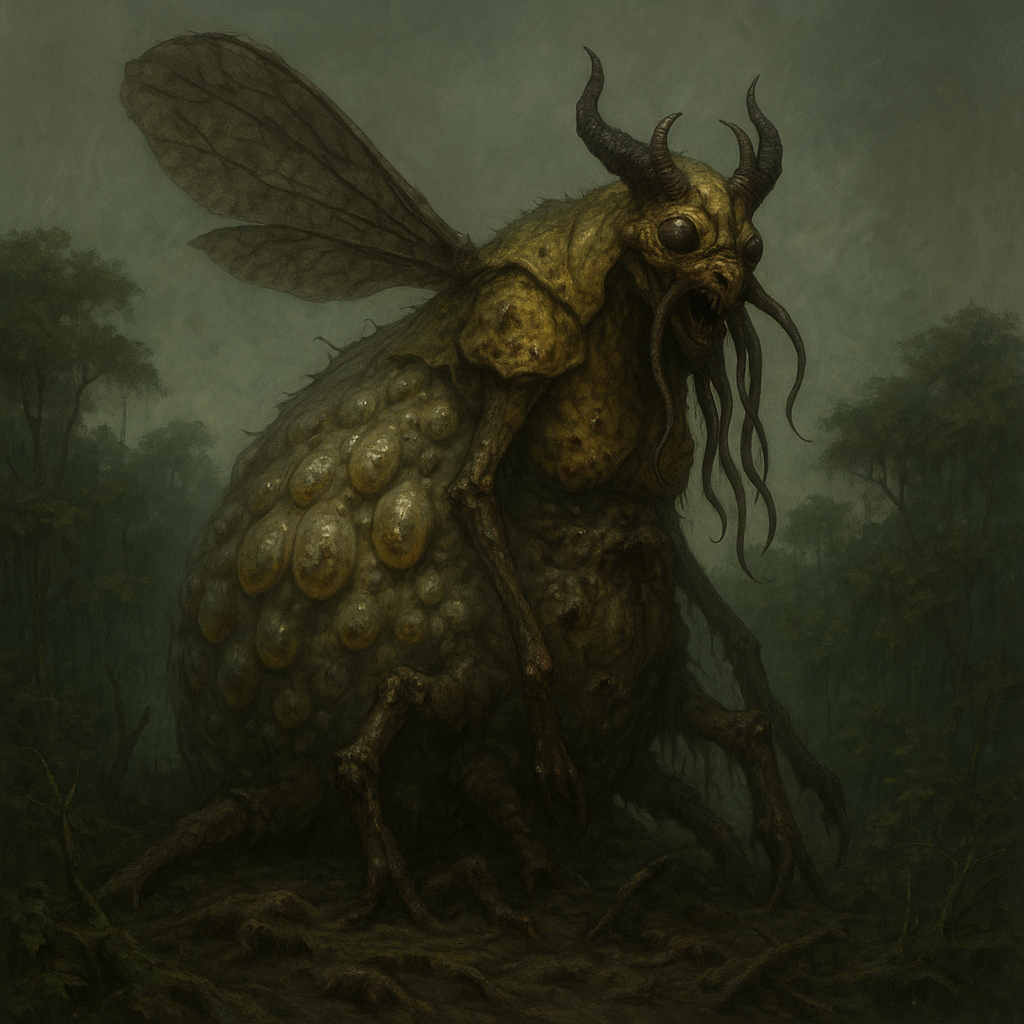 Vretchka is an impossibly large and bloated insect, not dissimilar to that of a common plague locust. Her pale gray abdomen is so grossly distended that it rises above the tall treetops of her jungle domain, and is festooned with thousands upon thousands of slime-coated birthing sacks. Each sack contains the gestating form of a new demonic insect, which are allowed to grow and feast upon her constantly-regenerating flesh until they are ready to join their brethren in the black skies above. Her colors change as one moves up along her disgusting form, shifting from grey to a shade of vomit as it reaches her hollow, needle-like ovipositor. Two gossamer wings extend from the shoulders upon her thorax, but they have long-since atrophied from a lack of use. Even if she wanted to fly, it is doubtful that she could as they are but a third of their former size. Her front four legs have since been crushed into a broken mess of flesh and bone under her obese bulk, while her back saltatorial legs have fared little better. Indeed, so massive and overgrown is her bulk that movement is all but impossible for her. At best, with great effort she can shift her bulk around once every decade or so to make herself more comfortable. The only part of her form that she can still move with any sort of agility or grace is the long, slender needle-like appendage that in dim light might be mistaken for an ovipositor. Vretchka favours using it to lash out and impale any who might dare to get close to her, before dropping their still-living bodies into her ever-hungry mouth.
